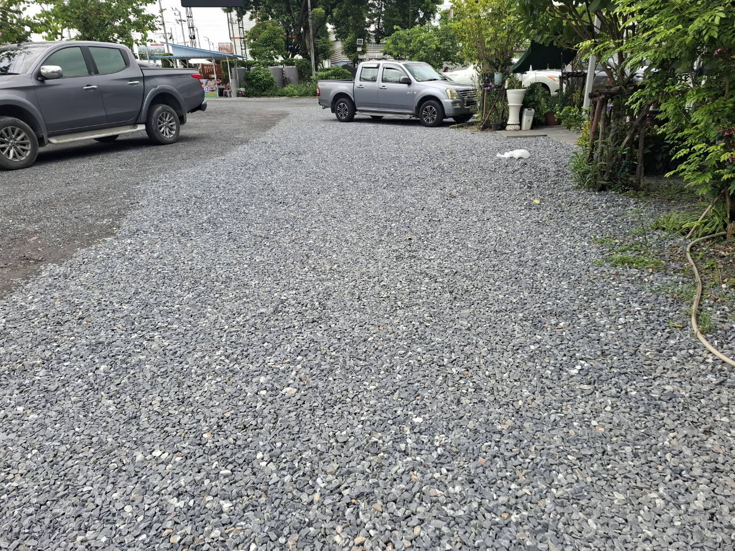 หินคลุกเหมาะสำหรับถมปรับระดับให้พื้นแน่น รองรับแรงกดได้ดี ส่วนหินเกล็ดมักถูกนำมาปรับแต่งผิวหน้าให้ดูสวยงาม มีความเรียบหรู และไม่แฉะเมื่อน้ำขัง เหมาะกับลานจอดรถที่ต้องการภาพลักษณ์ที่ดีและใช้งานจริงได้ในทุกสภาพอากาศ